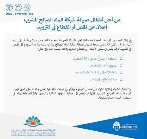 من أجل أشغال صيانة شبكة الماء الصالح للشرب إعلان عن نقص أو إنقطاع في التزويد مجتمع بواسطة هيئة التحرير في 26 مايو, 2025 شارك شارك FacebookTwitterWhatsAppالبريد الإلكترونيFacebook MessengerTelegramViberطباعة