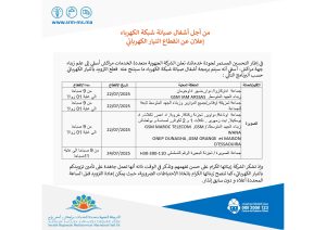 من أجل صيانة شبكة الكهرباء إعلان عن انقطاع التنيار الكهربائي مجتمع بواسطة هيئة التحرير في 18 يوليو, 2025 شارك شارك FacebookTwitterWhatsAppالبريد الإلكترونيFacebook MessengerTelegramViberطباعة