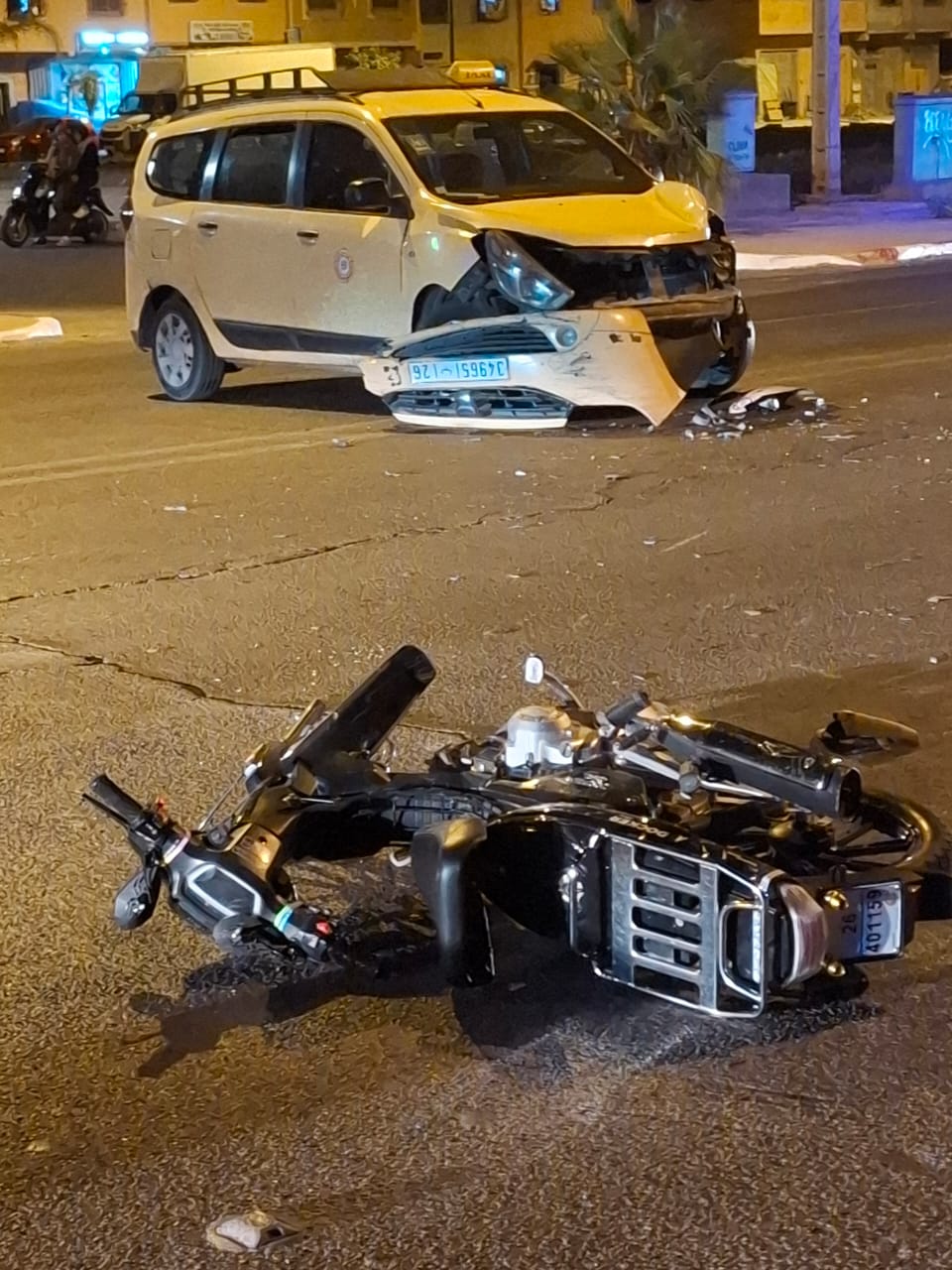 شهدت ليلة السبت بالقرب من نزل جنان فيزة حي الهبيشات طريق اوريكا ، اصدام سيارة أجرة من الحجم الكبير بدراجة نارية تقل شابين في العشرينات من العمر ، أسفرت الحادثة عن خسائر مادية في سيارة الأجرة و الدراجة النارية مع بعض الكدمات التي تعرض لها سائق الأجرة في حين تعرض الشابين لجروح مختلفة تطلبت العناية الطبية .