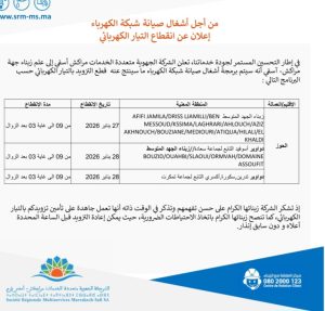 من أجل أشغال صيانة شبكة الكهرباء إعلان عن إنقطاع التيار الكهربائي مجتمع بواسطة هيئة التحرير في 25 يناير, 2026 شارك شارك FacebookTwitterWhatsAppالبريد الإلكترونيFacebook MessengerTelegramViberطباعة